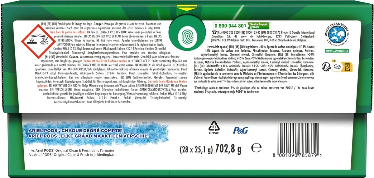 - Ecoclic kartonnen doos: Zorg voor minder plastic met Ariel All in 1 Wasmiddel Pods, nu in een recyclebare kartonnen doos die gemaakt is met 70% gerecyclede vezels en maximaal 5% plastic