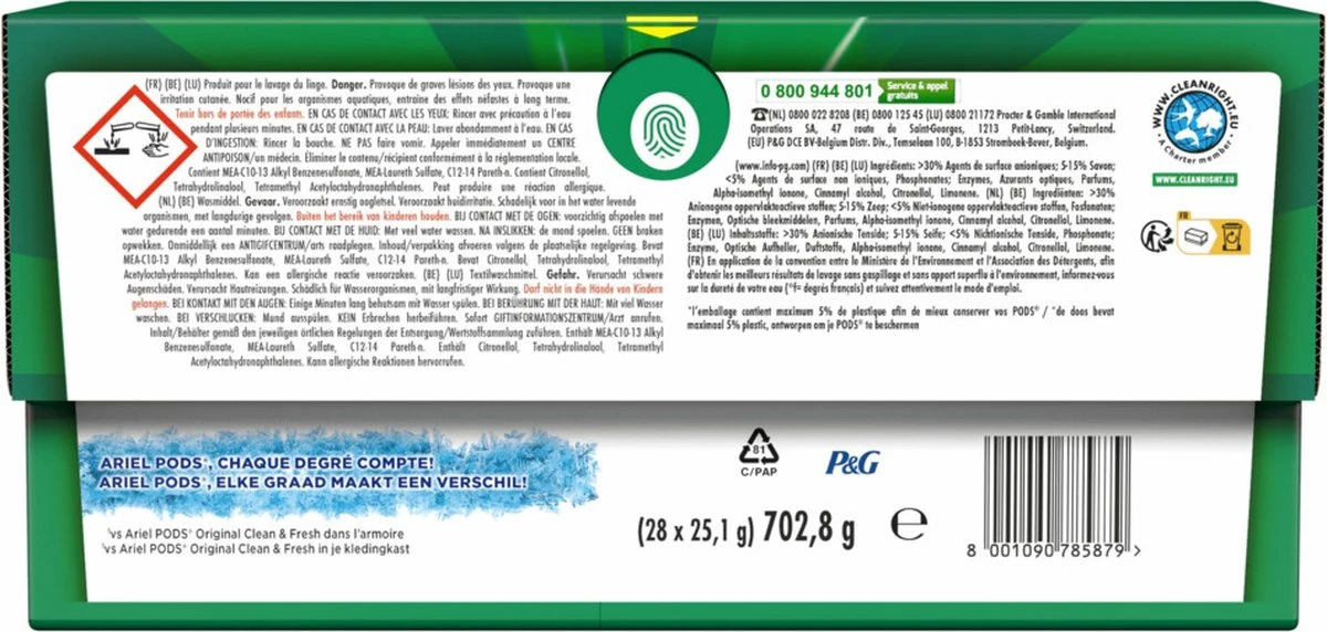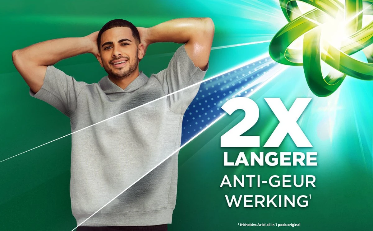 Ontdek Ariel Pods+ Wasmiddel met Actieve Geurbestrijding. Ze worden nu geleverd met een extra blauw vak en bieden een 2x langere anti-geurwerking (in vergelijking met Ariel All in 1 Pods Original Clean & Fresh in opslag). Ze zijn gemaakt in Frankrijk en ontworpen voor koud water met de unieke Cool Clean-technologie. Bij contact met water lost het laagje op om krachtige vlekverwijderende technologieën vrij te geven en Ariels diepe en sterke reiniging van Pods+ Actieve Geurbestrijding te bieden. Daarnaast kunnen de Ariel wastabletten nu helpen plastic te verminderen dankzij hun recyclebare Ecoclic-kartonnen doos. Het is gemaakt met 70% gerecyclede vezels en bevat maximaal 5% plastic, ontworpen om je Pods te beschermen.