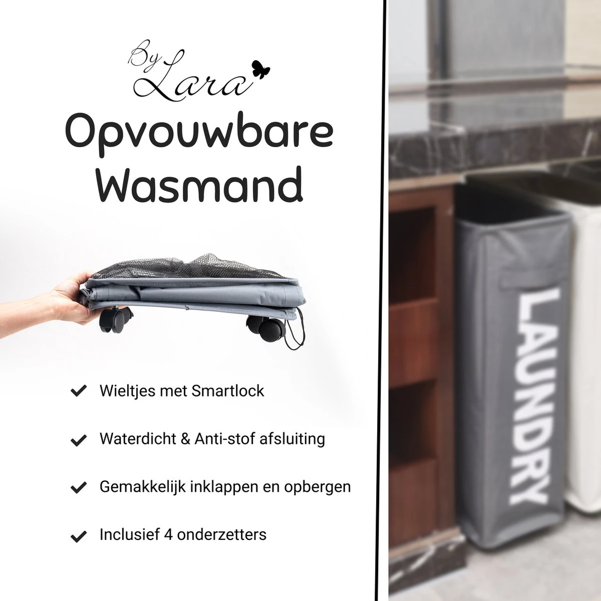 Anders dan reguliere wasmanden: de ByLara opvouwbare wasmand komt in een bescheiden formaat, en is voorzien van wieltjes en handvat voor optimaal gebruiksgemak. Zo bewaar en verplaats je tot wel 42L wasgoed, en berg je hem tussen wassen door even makkelijk weer op.