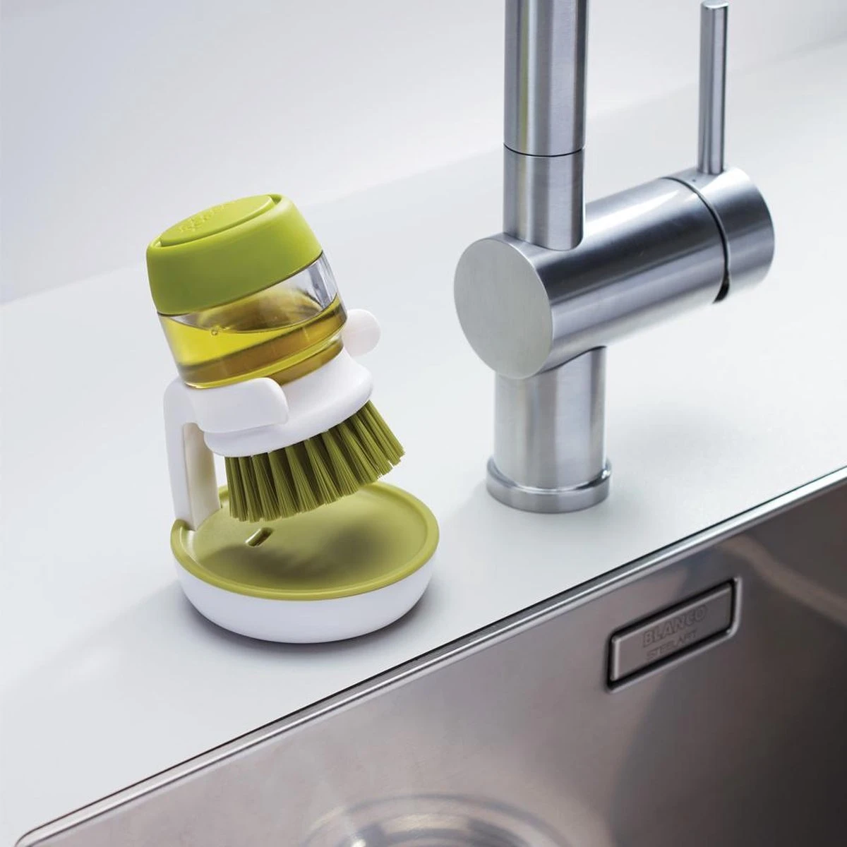 Deze innovatieve Palm Scrub afwasborstel van Joseph Joseph is ideaal voor het reinigen van pannen en servies. De afwasborstel is niet zo maar een afwasborstel, want deze is bevestigd op een handige zeepdispenser die u kunt vullen met afwasmiddel. Met 1 druk op de knop komt het afwasmiddel uit de dispenser via de afwasborstel, waardoor u servies en pannen eenvoudig kunt reinigen. Het afwassen van uw servies in een sopje is dus verleden tijd! Dit werkt niet alleen prettig, maar is ook hygiënisch. U hoeft servies en pannen nu nooit meer te reinigen in water dat al vervuild is. De afwasborstel heeft anti-kras borstelharen, waardoor u deze ook prima kunt gebruiken in pannen met een anti-aanbaklaag. De afwasborstel wordt bovendien geleverd met een handige houder. De houder vangt overtollig water en zeep, afkomstig uit de afwasborstel, eenvoudig op in het reservoir. U kunt de houder eenvoudig uit elkaar halen om het overtollige water en zeep weg te gooien. Daarna kunt u de houder eenvoudig reinigen in de vaatwasmachine. Hierdoor kunt u hygiënisch werken.