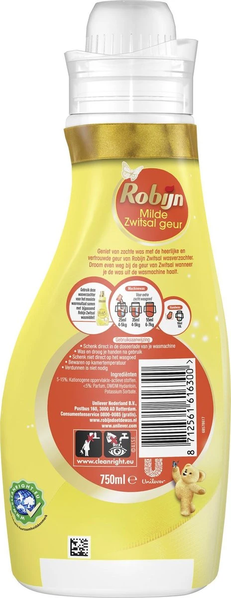 Laat je verrassen door de heerlijke geur van Robijn Collections Zwitsal wasverzachter. Robijn heeft de geur van deze Collections wasverzachter verbeterd, zodat je kunt genieten van een zachte was en een nóg betere geurervaring. De wasverzachter combineert de unieke geur van Zwitsal met de zachtheid die je van Robijn wasverzachters kent. De wasverzachter is lichtgeel van kleur en ruikt naar de herkenbare geur van Zwitsal. Je was ruikt door de wasverzachter van Robijn niet alleen heel lekker, maar het middel zorgt ook voor een speciale beschermlaag rondom de vezels van de stof. Dit zorgt ervoor dat er minder wrijving ontstaat tussen de vezels, met als gevolg dat je kleding zijn kwaliteit behoudt doordat het minder snel slijt en zijn pasvorm en kleuren behoudt. Daarnaast is je kleding makkelijker strijkbaar door de wasverzachter en droogt het sneller. Combineer met het bijbehorende Robijn Collections Zwitsal wasmiddel om zo lang mogelijk te genieten van alle stralende kleuren en heerlijke geuren in je kast.