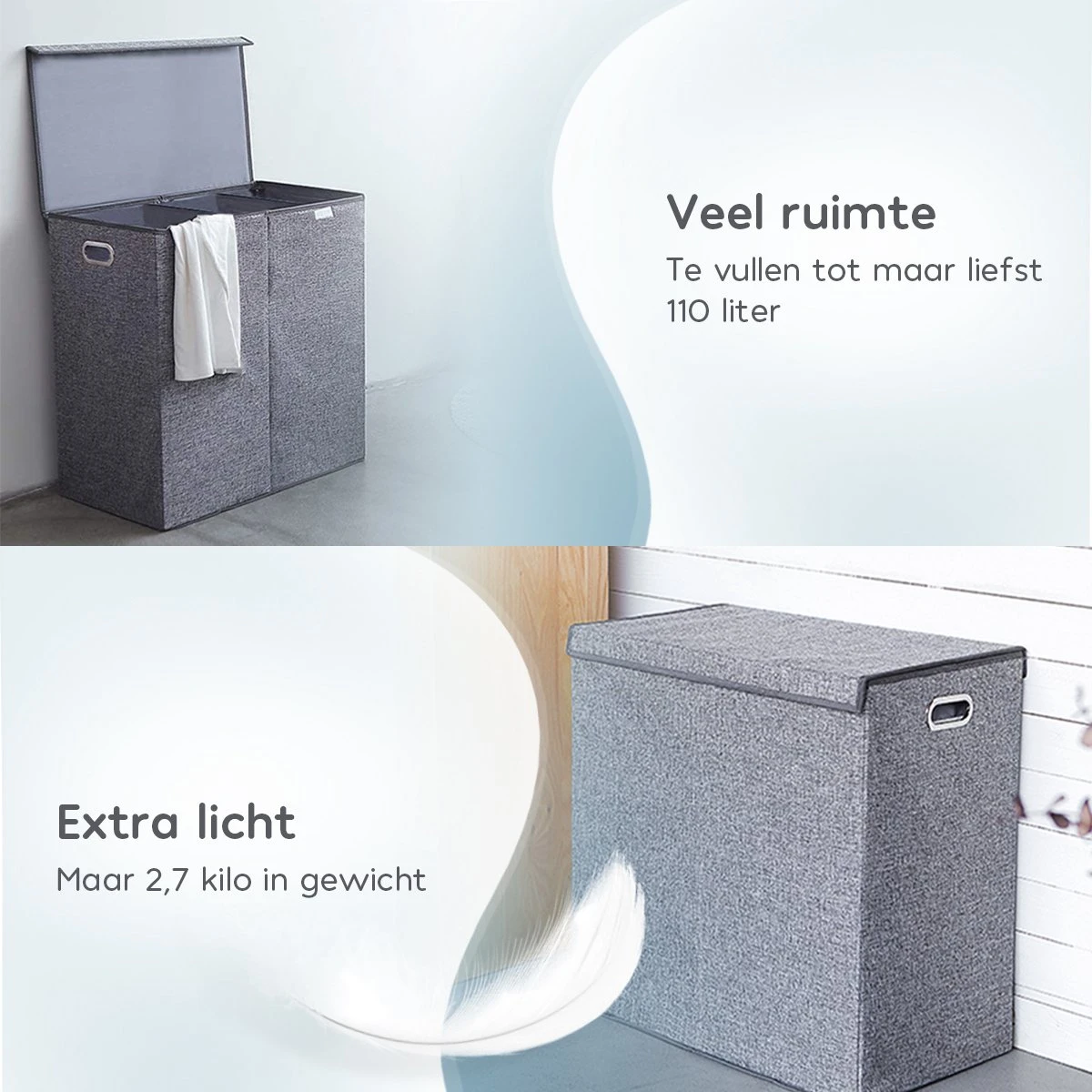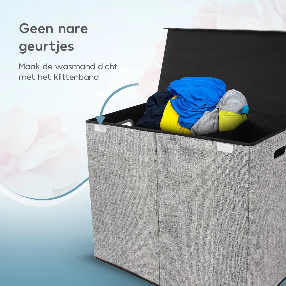 - Afsluitende deksel – Door de volledig afsluitende deksel heb je geen last meer van geurtjes die de was kan verspreiden. Door het mooie design van de wasmand, berg je jouw was in stijl op.